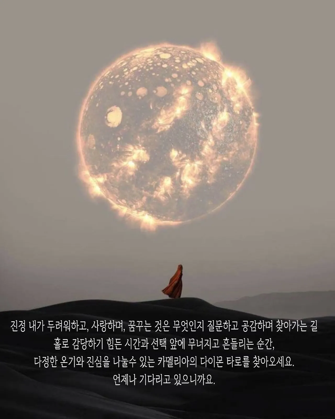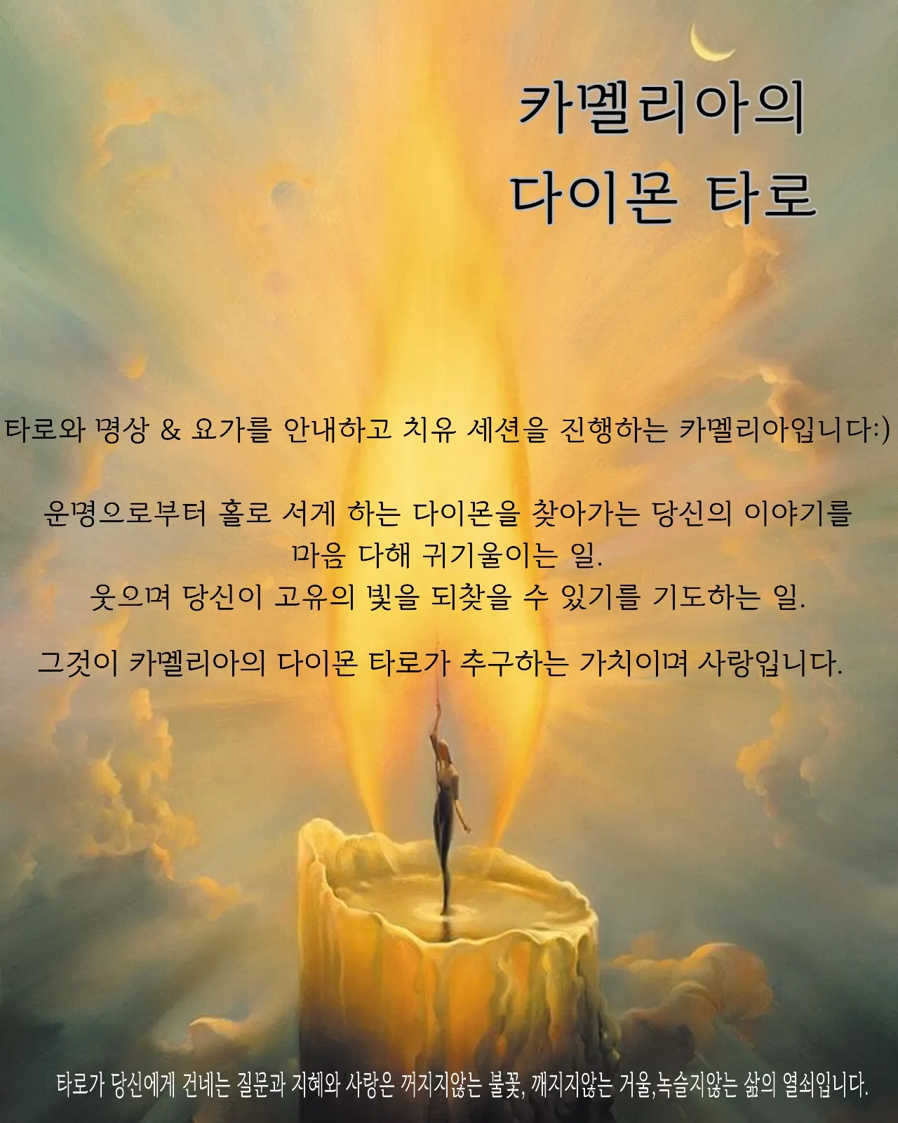 카멜리아의 다이몬 타로는 꺼지지않는 불꽃이자 녹슬지않는 열쇠가 되어드릴거에요.